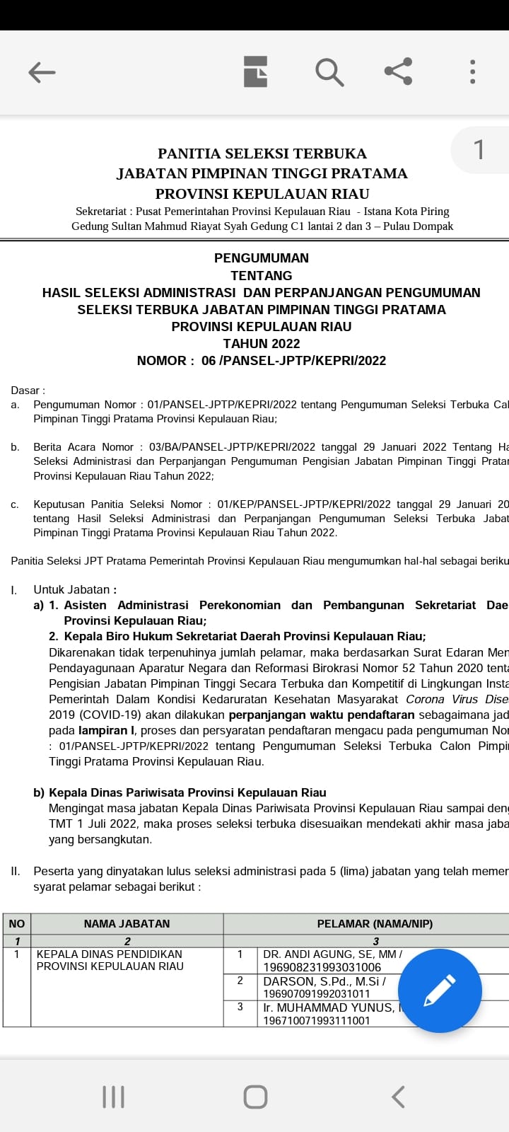 Hal itu di sampaikan Panitia Seleksi Terbuka Jabatan Pimpinan Tinggi Pratama Provinsi Kepri dalam pengumuman tentang hasil seleksi administrasi dan perpanjangan nomor 06 /PANSEL-JPTP/KEPRI/2022 tertanggal 29 Januari 2022, yang diterima infoluarbiasa.com, Ahad (30/1)