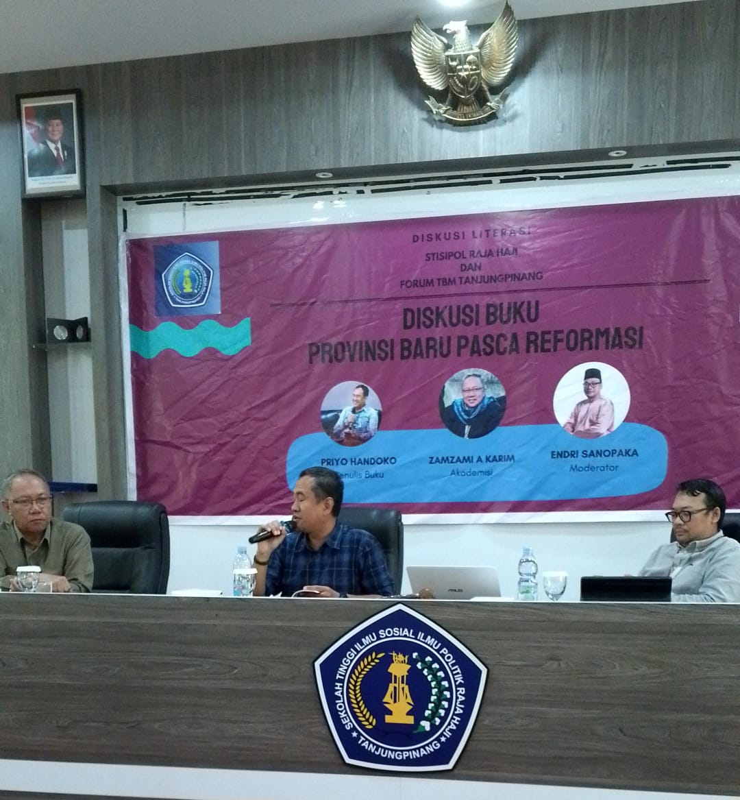 Tanjungpinang (infoluarbiasa.com)- Sekolah Tinggi Ilmu Sosial dan Ilmu Politik (Stisipol) Raja Haji Tanjungpinang bersama Taman Bacaan Masyarakat (TBM) Kepri mengadakan diskusi buku “Provinsi Baru Pasca Reformasi” karya komisioner KPU Kepri, Priyo Handoko, Selasa (18/11), di aula kampus Stisipol, Tanjungpinang.